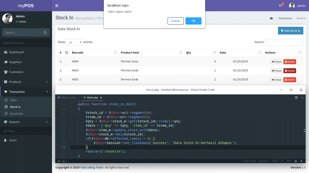 Halo semua. Melanjutkan seri POS, kali ini kita akan berbagi tutorial lanjutan fitur stock-in (pembelian) yaitu bagian proses hapus dengan alert konfirmasi (jika ok maka akan mengurangi data stock produk otomatis), dibuat dengan framework CodeIgniter dan Bootstrap.
