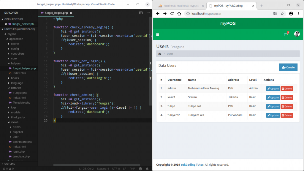 Setelah diawal kita membatasi hak akses apakah user terlogin atau tidak, sekarang kita tambahkan pembatasan hak akses role level tiap user di codeigniter. Tapi untuk tutorial role group user atau RBAC (Role Based Access Control) dan menu dinamis belum ada di seri ini, mungkin di seri2 selanjutnya. Subscribe saja channel YukCoding agar tidak ketinggalan tutorial-tutorial menarik lainnya.